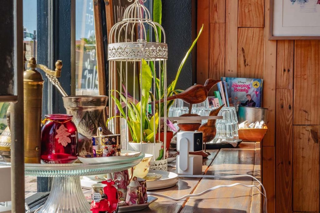 With original artwork adorning almost all the walls, passages from Alice’s Adventures in Wonderland handwritten on the front counter, a tiny door for visiting fairies, an old steamer chest, vintage silver serving trays, and an entire wall dedicated to highlighting local artists’ work, the Red Bud Cafe’s intention is to enchant your taste-buds as well as your other senses. And yes, we have free Wi-Fi!